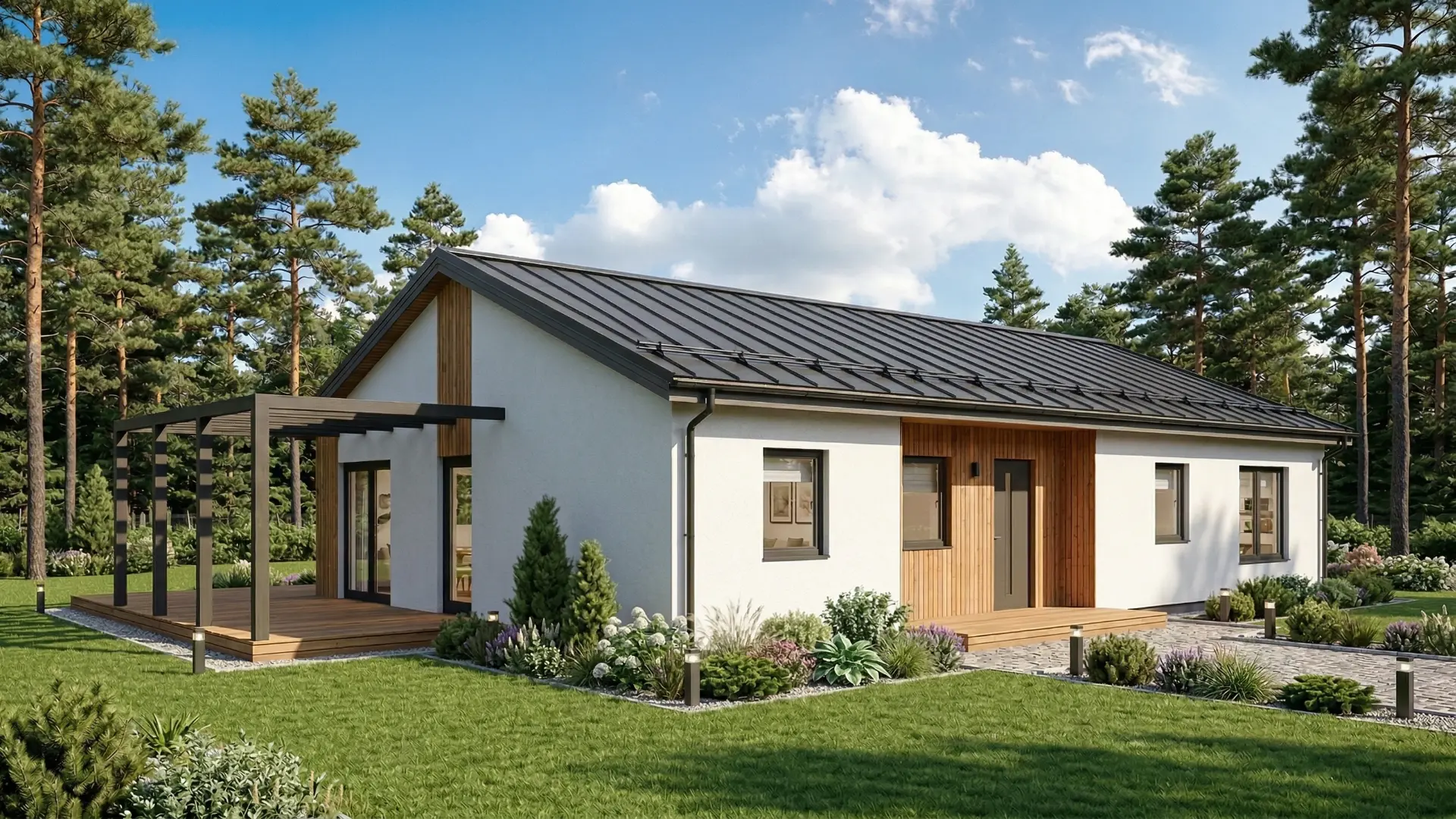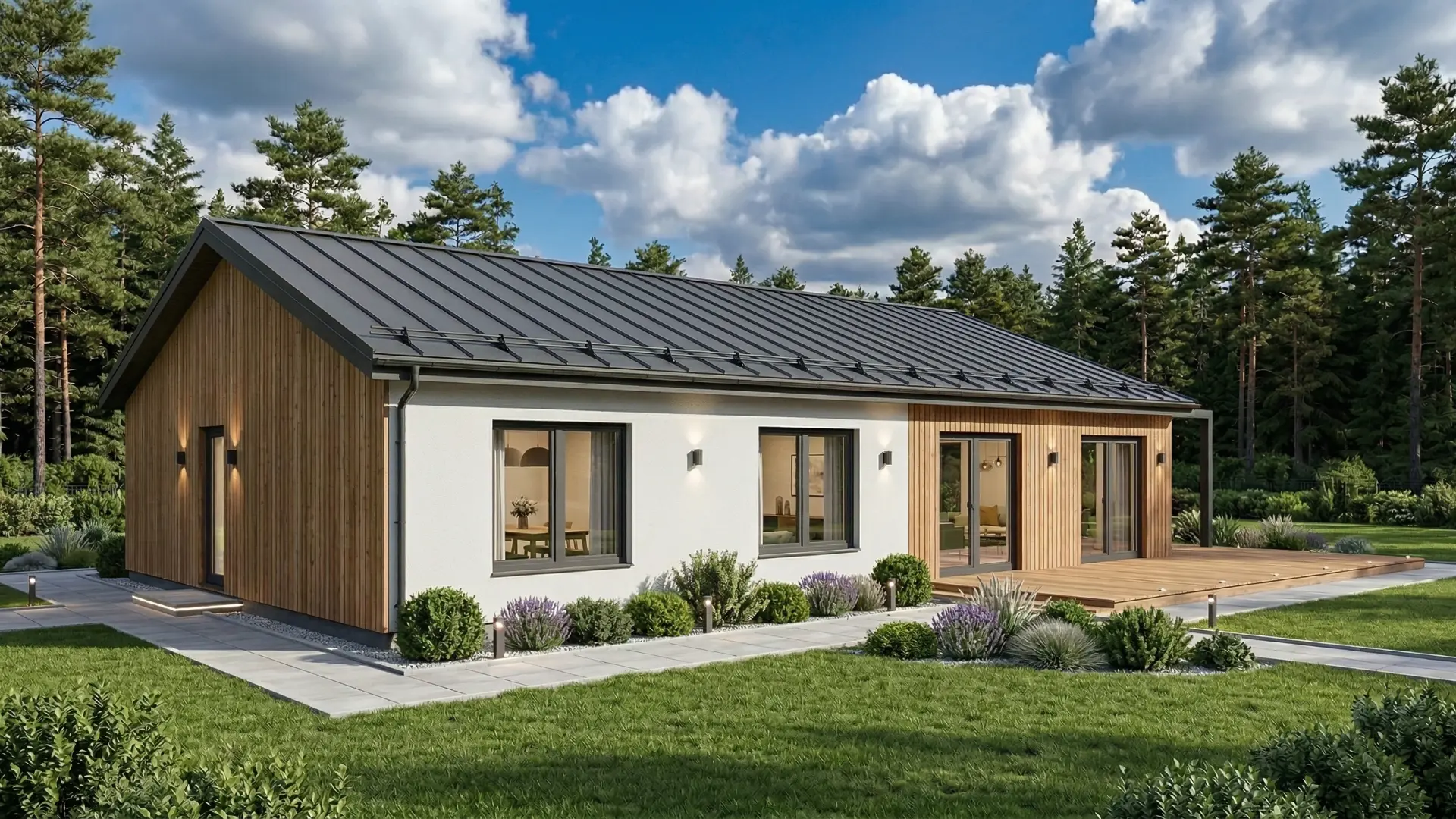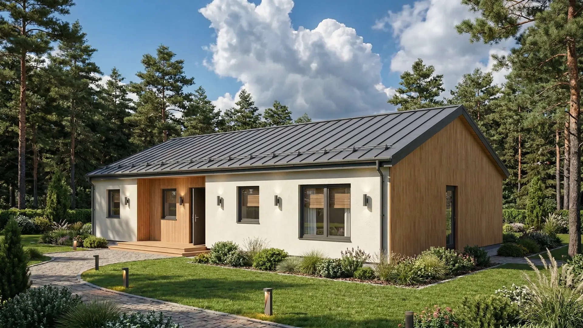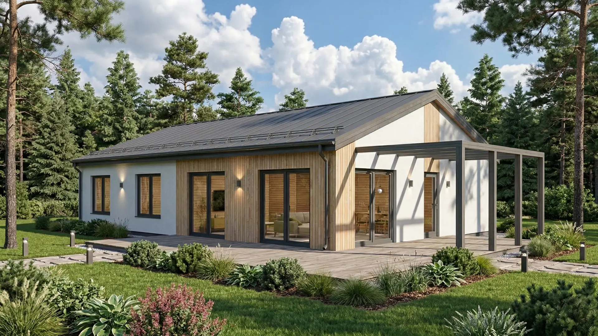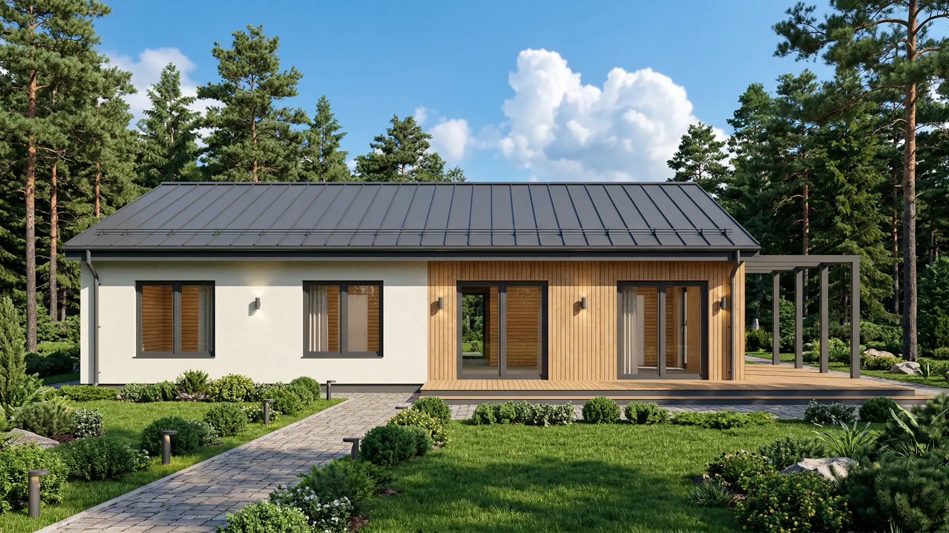 Фасады адаптируются под стиль и участок: планкен и штукатурка, полностью дерево или фиброцемент.